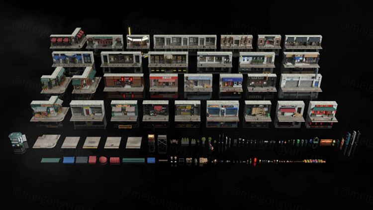 通过大量供应的餐厅、陈列室、银行、杂货店、精品店、剧院、博物馆等,为您的 3D 城镇增添一些个性。这些街道立面的范围可以从高端大理石入口到带有涂鸦的木板窗户——它们都可以根据您的喜好定制不同的遮阳篷、标牌、装饰植物和其他常见的店面道具。