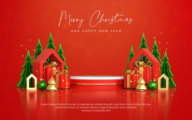 图穷联素材库 » 圣诞节新年快乐3D元素装饰红色背景节日促销海报PSD模板