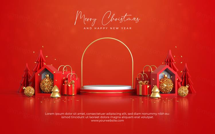 图穷联素材库 » 圣诞节新年快乐3D元素装饰红色背景节日促销海报PSD模板