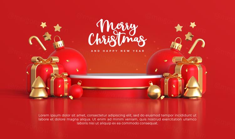 图穷联素材库 » 圣诞节新年快乐3D元素装饰红色背景节日促销海报PSD模板