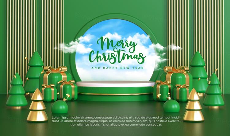 图穷联素材库 » 圣诞节新年快乐3D元素装饰绿色背景节日促销海报PSD模板