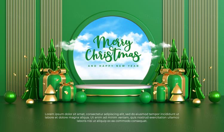 图穷联素材库 » 圣诞节新年快乐3D元素装饰绿色背景节日促销海报PSD模板
