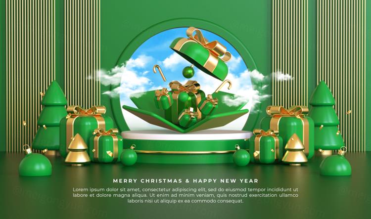 图穷联素材库 » 圣诞节新年快乐3D元素装饰绿色背景节日促销海报PSD模板