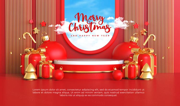 图穷联素材库 » 圣诞节新年快乐3D元素装饰红色背景节日促销海报PSD模板