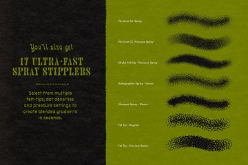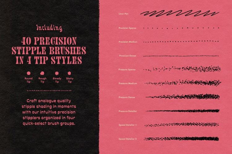 每个精密画笔组都包含多个带有匹配笔尖和衬里的预设,可随时处理任何点画任务,从细微的边缘阴影到大的混合渐变和渐变。