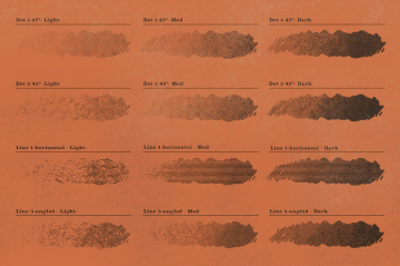 25 种连续色调点、线和交叉阴影画笔,5 种色调,从 10% 到 90%