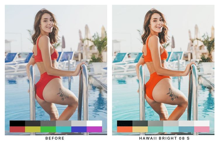Hawaii Bright (10 个预设)- 使用这些明亮而充满活力的 Lightroom 预设让色彩流行起来。颜色转向令人赏心悦目的木瓜红、青色和粉红色。