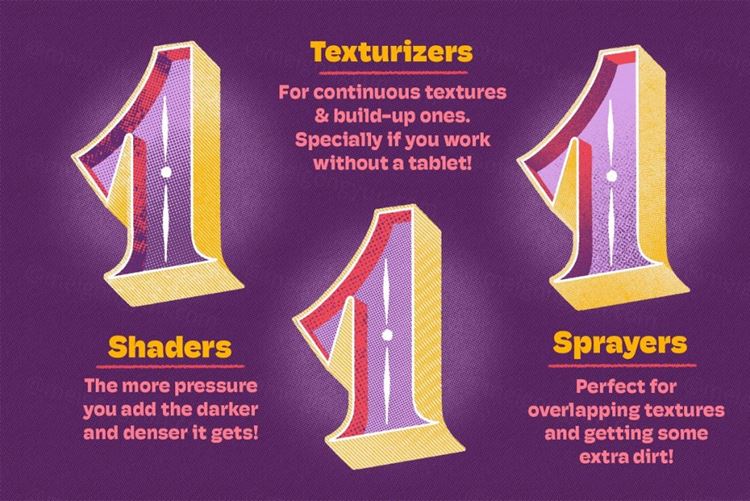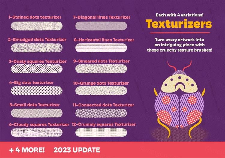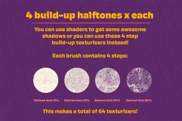 我们认为是时候换一个新的画笔包了,这就是为什么我们准备了这个多汁的半色调画笔套装!这个画笔集是关于半色调和你可以用它们做的所有很酷的效果。这些纹理是从现实生活中的纹理中采样出来的,并经过数字处理以作为无缝图案工作。使用这种调皮的笔刷,您将能够平滑地添加纹理和阴影,并为您的作品增添一些肮脏的光彩!此外,我们还包括5 个额外的刷子。甜,对吧?