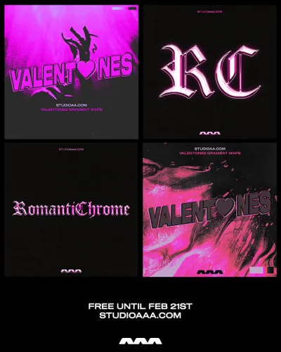 20 张用于 Photoshop 的渐变贴图,具有深红色、紫色和粉红色,灵感来自情人节!易于在库存照片或渲染上使用以重新着色您的作品!渐变贴图采用 .GRD 格式,只需单击几下即可轻松安装和使用。