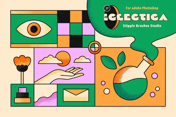 我们突然意识到我们不想遵循任何现有的设计风格。因此,我们选择了我们最喜欢的波普艺术并添加了一些现代气息来创造完全独特的东西。成功了吗?好吧,发现我们新的Eclectica Photoshop 笔刷,亲眼看看吧!