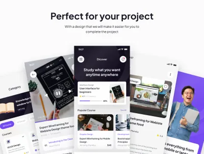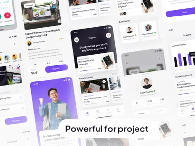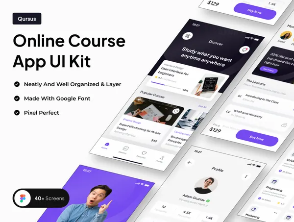 Qursus 是一个 Minimaslist 设计的 UI 套件,适用于具有 40 多个屏幕的在线课程移动应用程序。