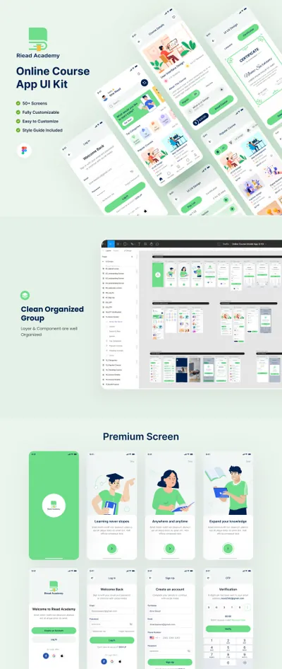 “Figma 在线课程移动应用程序 UI 套件”。它帮助学生解决他们的学习问题,并为实现他们的目标提供指导。