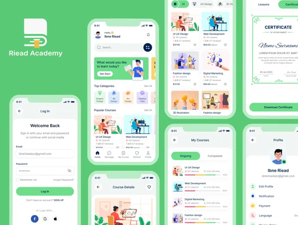 网校网络培训机构在线网课移动APP小程序界面UI素材 Online Course Mobile App UI Kit