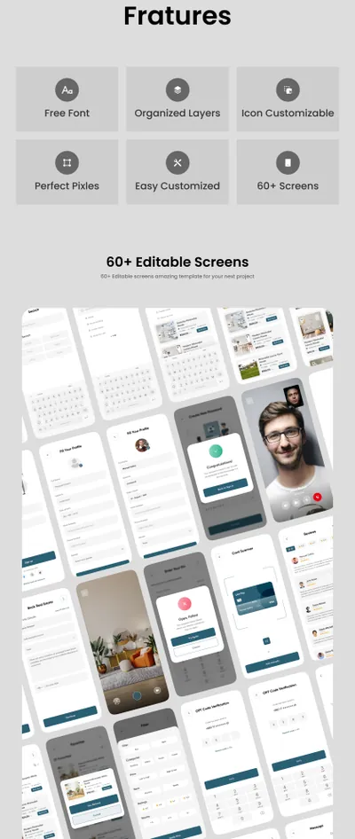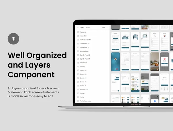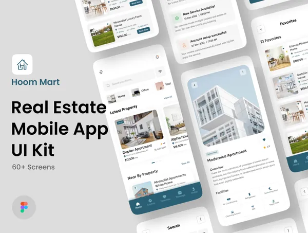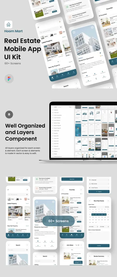 Hoom Mart – 房地产应用程序 UI 套件,由 60 多个像素完美的屏幕组成,易于使用。该套件很容易完全根据您的喜好进行定制,它利用了所有功能,包括全局颜色、字体样式、动态组件和变体。Hoom Mart 非常适合经纪代理服务、租赁业务、住宅房地产经纪人、住宅和商业开发商、建筑公司,房地产设施,建筑公司。我们不仅为草图文件创建版本,还为 Figma 文件创建版本,因此它真的很容易编辑。易于使用,屏幕已准备好用于 iOS 和 Android 应用程序。您可以轻松更改任何设计。它很容易定制,也有很好的文档记录。