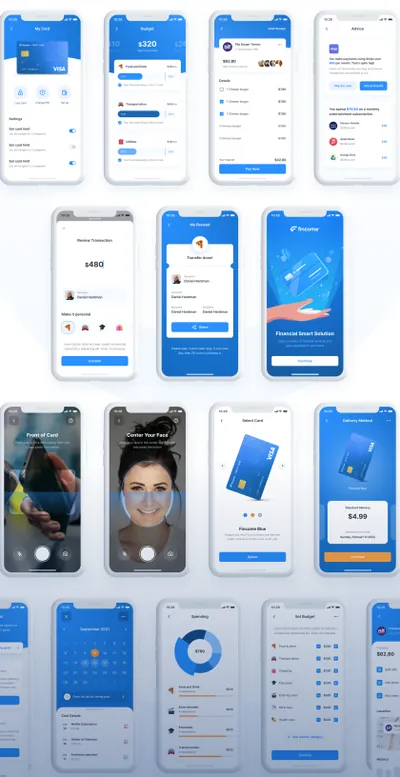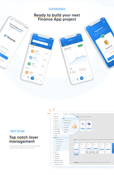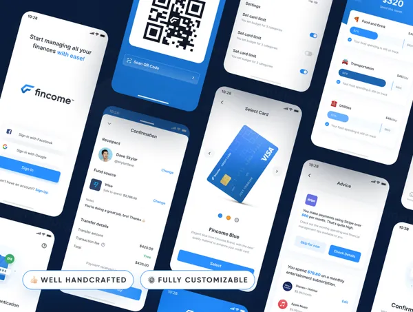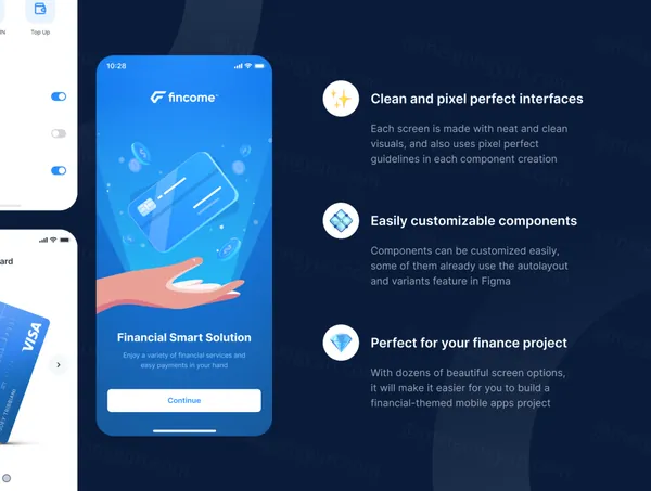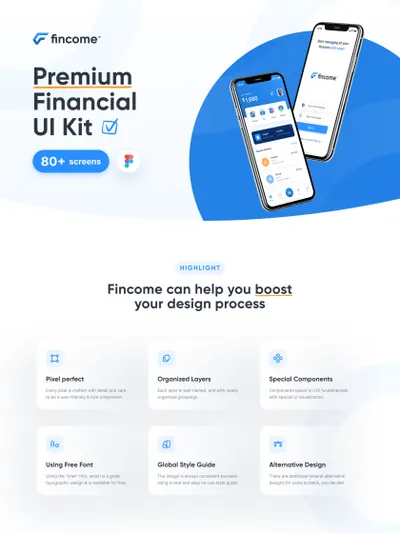 Fincome 是一款优质的金融应用程序 UI 套件,具有 80 多个高质量屏幕,并且在 Figma 中易于使用,采用 Love 和 UX 友好的设计。