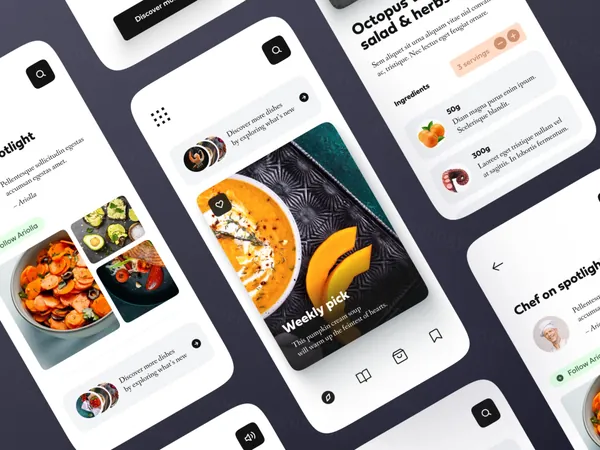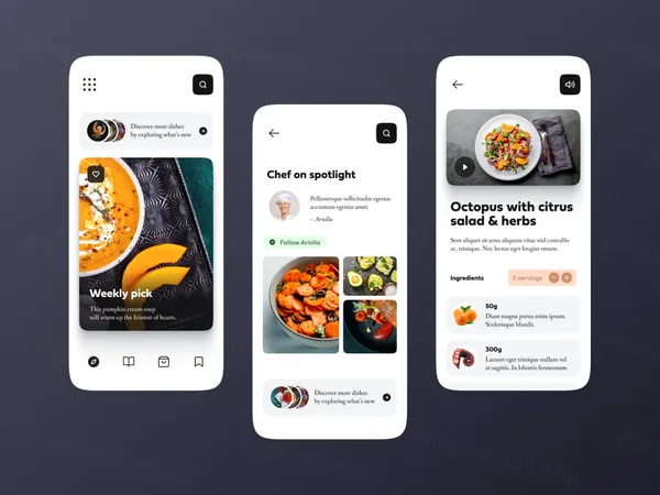 图穷联素材库 » 美食菜谱移动APP概念程序界面UI素材免费分享 Food recipe mobile app