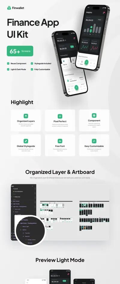 Finwallet UI Kit 适合且易于完全定制以满足您的需求。Finwallet UI Kit 为您提供分层和组织良好的设计、像素完美的设计、免费的惊人字体和支持组件,使其更容易。