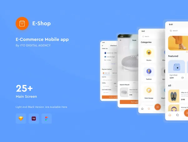E-Shop 是一个关于电子商务的现代 Ui 套件,也适用于所有企业,非常适合新业务。首先,我们将电子商务应用程序信息架构、用户流程、草图、线框和 UI 设计作为 Figma UI 套件进行,因此 E-Shop 是最适合您的电子商务应用程序的 UI 套件这种具有良好用户体验的创意和现代设计