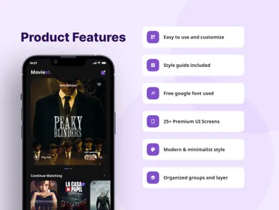 Moviest 与 Figma 兼容,并且具有良好的层和组组织设计。有 25 个以上的屏幕可以很容易地定制,还有一个风格指南,如字体和颜色。