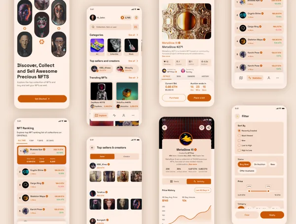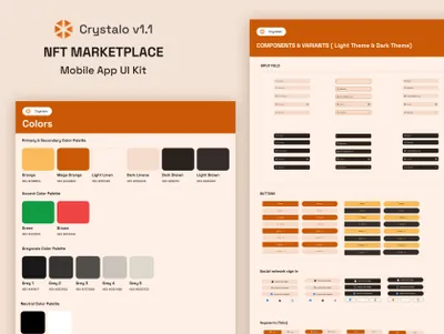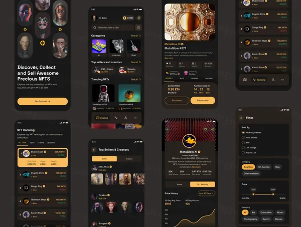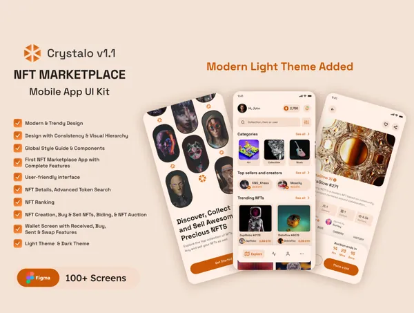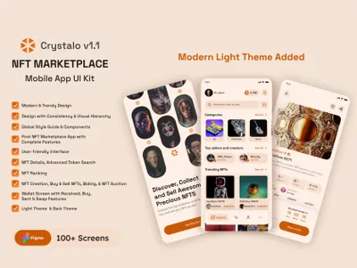 Crystalo 是一款优质的 NFT 市场应用程序 UI 套件,具有 100 多个高质量屏幕,具有现代、时尚的 UI 设计和高保真明暗主题。