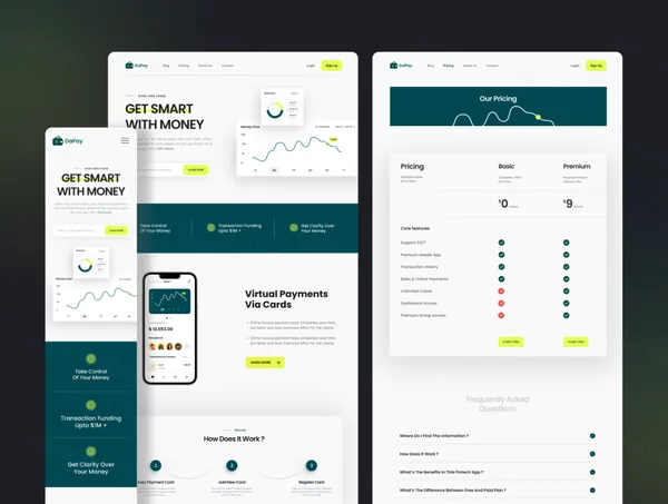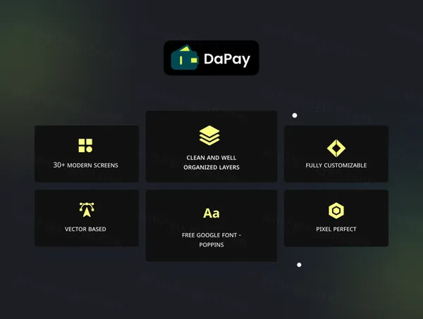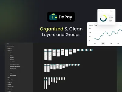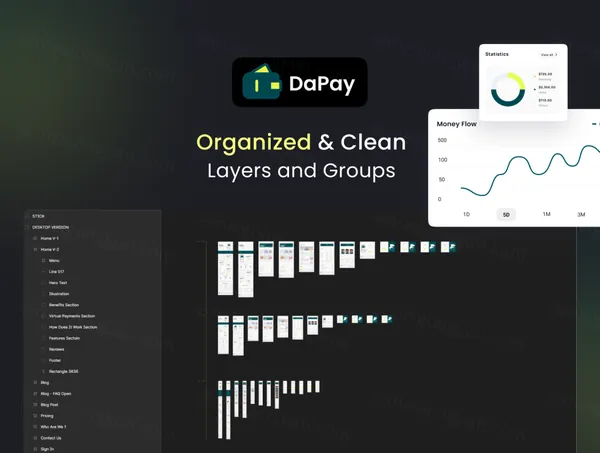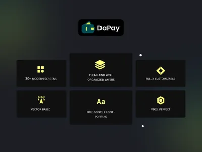 DaPay 是一款优质的金融科技和金融登陆页面 UI 套件,具有 30 多个高质量屏幕,易于在 Figma 中使用,精心制作,具有爱和 UX 友好的设计。