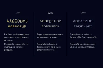 多语言(基本拉丁文、西欧文、欧元、加泰罗尼亚文、波罗的海文、土耳其文、中欧文、罗马尼亚文、泛非拉丁文、荷兰文、南非荷兰文、基本希腊文、基本西里尔文、数学运算符)