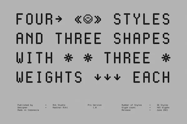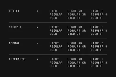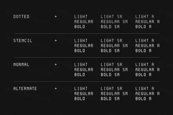 Cygnito Mono Pro 是一种等宽字体设计,由 3 种形状构成:圆形(圆形)、鼠形(半圆形)和八角形结构。此专业版有 4 种样式,每种样式有 3 个重量。灵感来自工业设计和现代主义。这种字体采用模块化架构构建,非常适合编程应用程序和技术驱动的设计项目。它还非常适合设计以数学、科学、计算机和 UI/UX 应用程序为中心的项目。