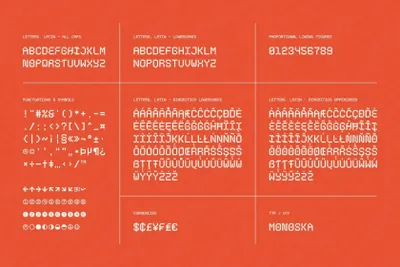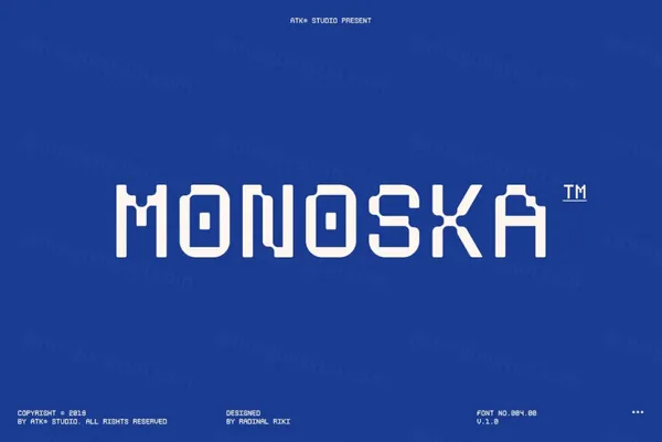 Monoska 是一种显示等宽字体,由 Radinal Riki 设计,具有经典的工业品味和圆润的字体风格。灵感来自复古 vhs 字体。为我们现代技术世界中的电子显示创建,例如邮政装箱单、机票、信息视频显示、广告、徽标等。只有一种重量,整个字体都是大写的,并且具有涵盖 130 多种语言的字符集。