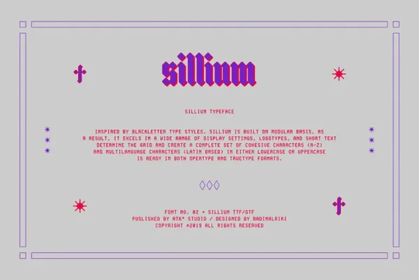 灵感来自 blackletter 字体样式。Sillium 建立在模块化的基础上。因此,它在广泛的显示设置、标识和短文本方面表现出色。确定网格并创建一组完整的小写或大写内聚字符 (az) 和多语言字符(基于拉丁语)。支持 Opentype 和 Truetype 格式。