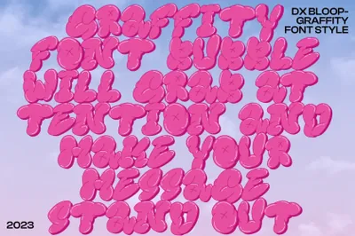隆重推出我们的最新字体:Graffiti Bubble Dx Bloop!该字体采用大胆、俏皮的字母,采用活泼的风格,可为任何设计增添有趣的触感。通过三种不同的样式 - 实心填充、轮廓和 3D 浮雕 - 您可以为您的项目选择完美的外观。3D 浮雕风格为您的设计增添了独特的深度和纹理,使它们从页面上脱颖而出。凭借其色彩缤纷、引人注目的设计,该字体非常适合创建引人注目的标题、标题或徽标。立即下载,为您的设计增添有趣、俏皮的感觉!