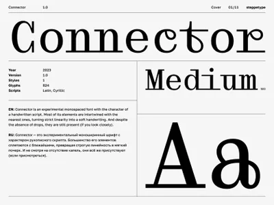 Connector 是一种实验性等宽字体,具有手写体的特征。它的大部分元素都与最近的元素交织在一起,将严格的线性变成了柔和的笔迹。尽管没有水滴,它们仍然存在(如果你仔细观察的话)。