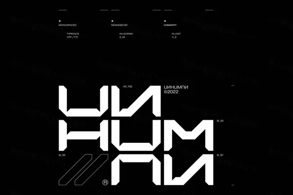 UNHUMAN 的灵感来自未来主义氛围,尤其是赛博朋克和新东京。字体基于简单的形状和 45° 切割的宽体。这是一个由 AN Gorski 创建的高科技项目。