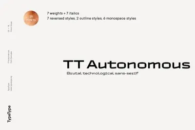 这就是字体家族 TT Autonomous 的由来。它是现代残酷的技术无衬线字体。字体的基本视觉特征是明显的方形字符和棱角分明的内部空间。此外,字体比例往往看起来是等宽的,但实际上并不是等宽的。字符的宽度受到汽车标识比例的启发,这些比例大多相当宽。