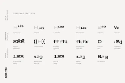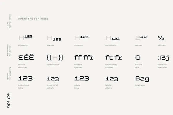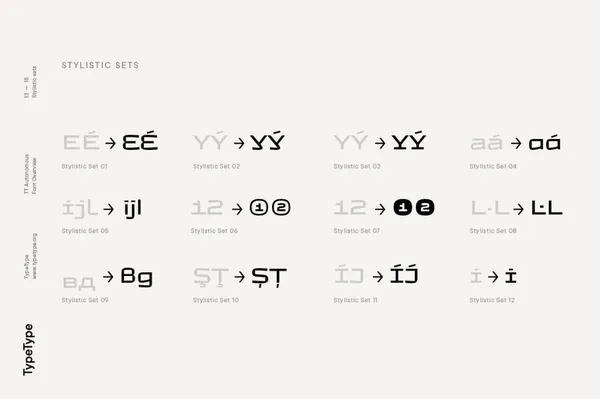 TT Autonomous 是一个复杂的字体系列,由 29 种字体组成,旨在解决广泛的设计任务。总体而言,该字体系列具有 14 种常规样式、6 种等宽样式、7 种反转样式和 2 种轮廓样式。字形的数量从等宽字体的 630+ 到基本样式的 790+ 不等。基本子家族有交替字符、连字、旧式数字、斜线零和许多其他有用的功能。