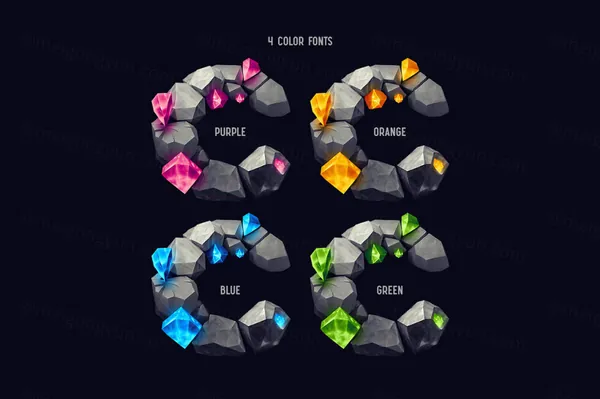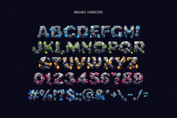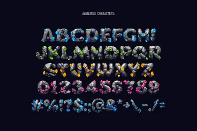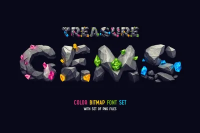 你好!呈现神奇风格的字体集——Treasure Gems。这是一种由灰色宝石和发光宝石制成的奇幻艺术字体。此套装有四种颜色可供选择。首先,它是一种彩色位图 OpenType-SVG 字体,可以用作普通的 OTF 字体。还包括一组具有透明背景的全分辨率 PNG 文件。考虑到仅支持英语和基本标点符号,请查看包含所有可用字符的屏幕截图。