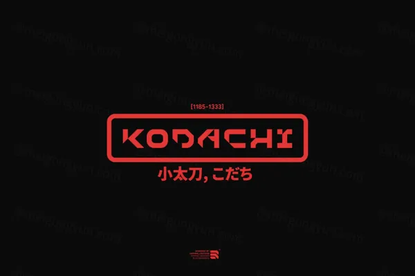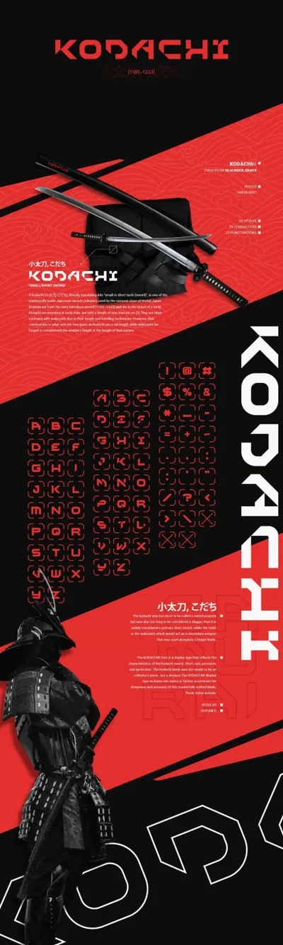 Kodachi 显示字体的灵感来自日本同名短剑。该字体的大写字符中的尖角和切口证明了这一点。此字体还带有一组小写字符(没有剪切)。这种小写字母非常适合副标题或较小的正文。