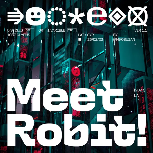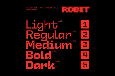 ROBIT 是一种科技野蛮字体,具有巨大的墨水陷阱和人性化的形状。从科幻视觉文化、未来主义和工业设计中汲取灵感, ROBIT 由 5 种风格组成,采用可变字体技术,为用户提供了大量的实验机会。锁定其开放式功能,您可以找到各种风格的替代品,以及大量不寻常的连字、箭头、图标等。
