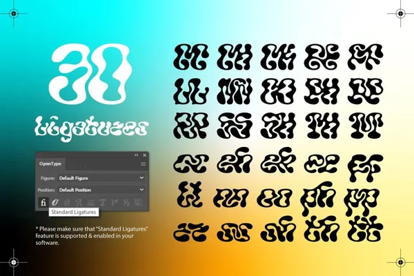 你好!介绍一种名为 Drunk Vision 的创意字体。这是一款抽象形状光滑的字体,具有时尚的扭曲形状。该字体包含许多多语言字符(请查看带有可用字母和符号的屏幕截图)。三十种精美的连字将使您的字体更加有机和自然(您可以通过激活 OpenType 面板上的“标准连字”来访问这些连字)。