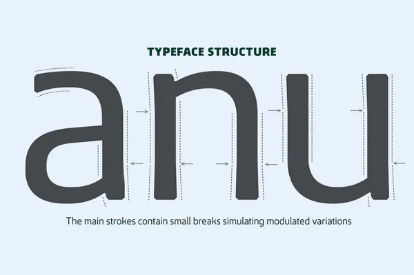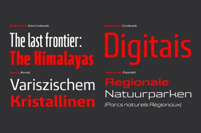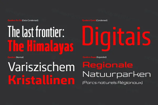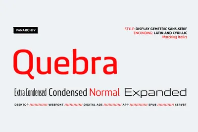Quebra 是一个扩展显示无衬线字体系列,具有四种宽度(Extra Condensed、Condensed、Normal 和 Expanded)和十种粗细,提供斜体版本。主要笔划包含模拟字母形式调制变化的小断点,这些细节更多地出现在大字体上。所有字体版本都包含拉丁文和西里尔文编码字符以及连字、区分大小写的形式、分数、旧式和最后的表格数字。
