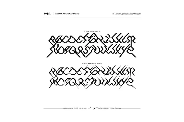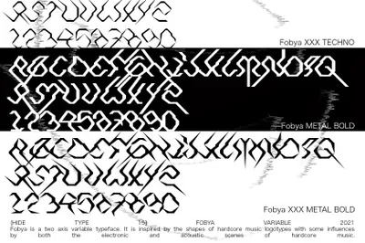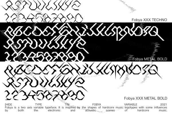 Fobya 是一种两轴变量字体。它的灵感来自硬核音乐标识的形状,并受到硬核音乐的电子和原声场景的一些影响。该字体包含 4 种不同的可变权重:Fobya TECHNO、Fobya XXX TECHNO、Fobya METAL BOLD、Fobya XXX METAL BOLD。