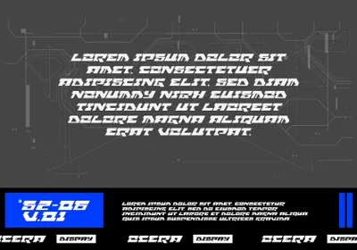 “OCERRA”是一种由 uncarving 设计的字体,灵感来自现代大胆的主题,带有斜体触感,保持简洁和独特的形状非常适合用于与游戏、未来科技、太空旅行、虚拟现实等相关的项目!