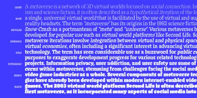 Keratine 还严重依赖可变标识,因为字体随着重量动态变化,从对比鲜明的、面向文本的浅色范围发展到更具表现力和更暗的显示范围,总共有 8 个斜体字重。开放式特征和字形交替进一步丰富了这种字体的使用可能性,通过在哥特式和人文主义风格之间的十字路口拥抱矛盾的复杂性,同时以一种数字化的野蛮精神产生共鸣,进一步丰富了这种字体的使用可能性。