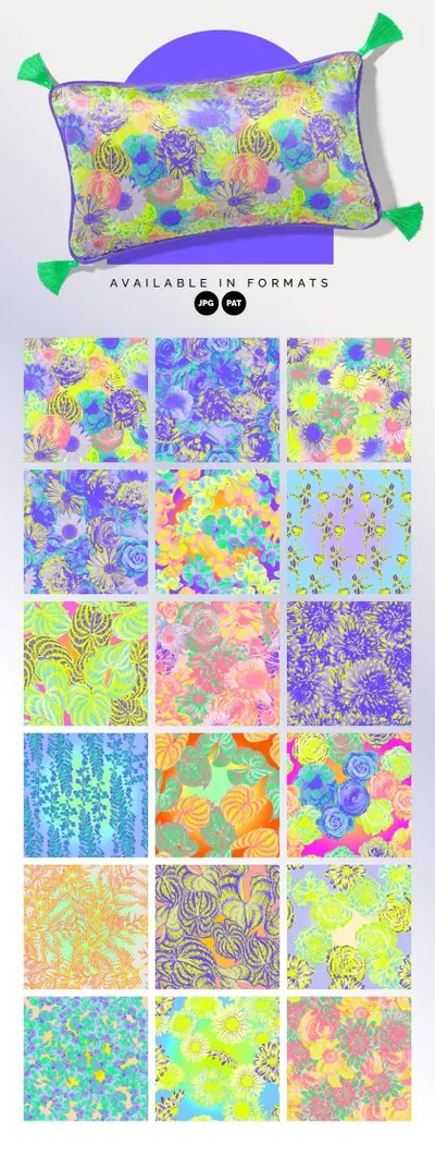 复古酸性艺术霓虹灯迷幻花卉植物图案设计素材合辑 Neon Floral Maximalist Patterns