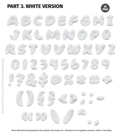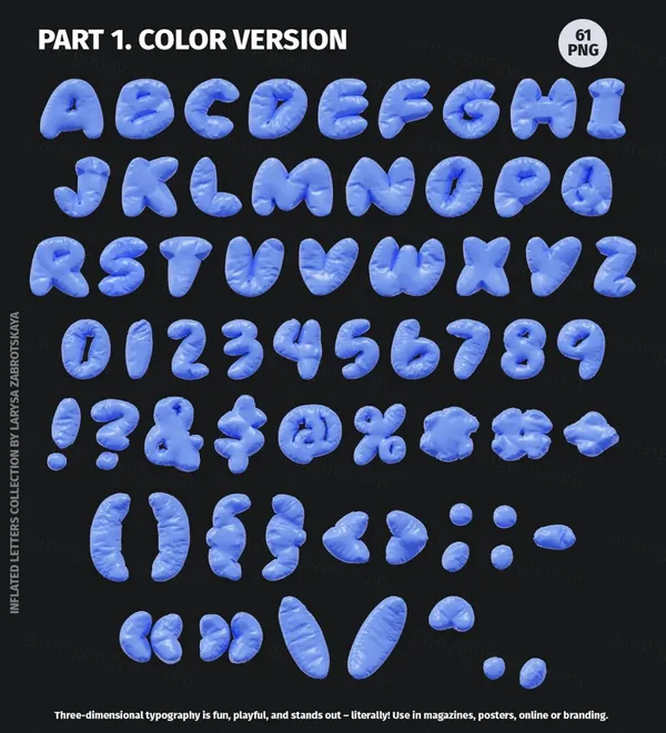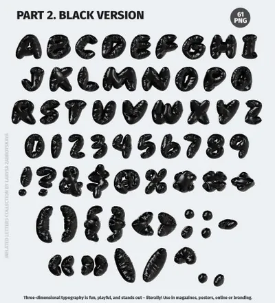4 个版本 - 黑色、白色、彩色、银色 - 包括 61 个膨胀的字母、数字和特殊字符;