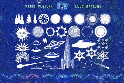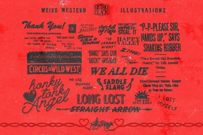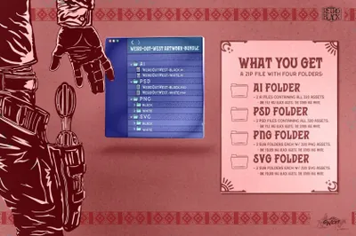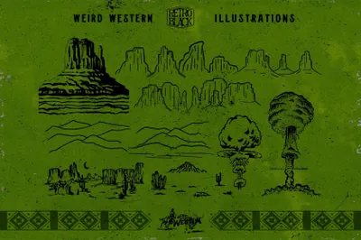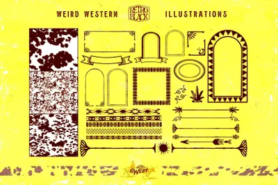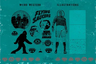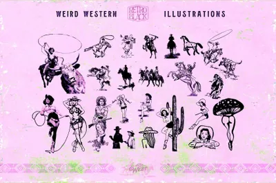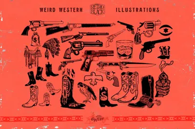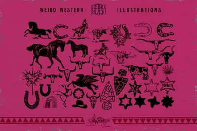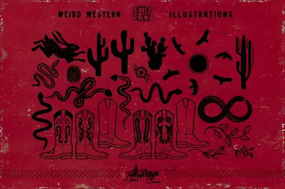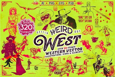 它的“Getting Weird Out West”是一个包含320 个西部/牛仔风格矢量的大型资产包。此包中的矢量由插图、图形、字符、短语、独特的形状、边框和品牌元素制成,其中大部分是复古/复古回收。