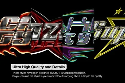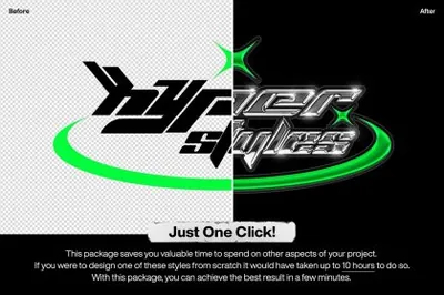 该系列由受 y2k chrome 设计风格启发的样式组成,只需单击一下即可帮助您将纯文本、徽标或形状变成杰作。这些样式将帮助您节省工作时间和精力。只需在工作表上输入您的徽标并保存文件。您还可以自定义设计,因为所有层都是打开的。然后您可以使用背景或透明样式导出。