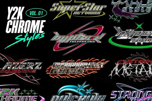图穷联素材库 » 高质量复古Y2K千禧风酸性艺术镀铬金属3D文字特效PSD模板 Y2K Chrome Text Effects
