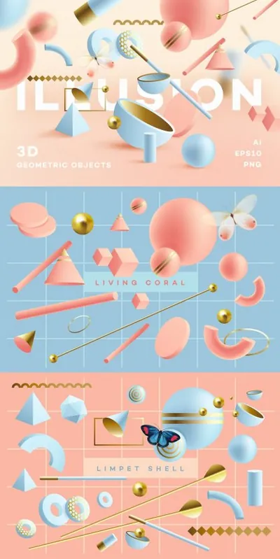 欢迎来到幻觉!一个神奇的场景,探索梦幻般的梦幻环境和构图。步入幻觉世界,将 3D 渲染引入您的设计和项目中。该套装包含 80 个独立的 3D 对象,您可以使用它们来组装您自己的迷人作品。我为这套衣服选择了今年最流行的颜色组合:活珊瑚橘、公主蓝、帽贝壳和韭菜花。