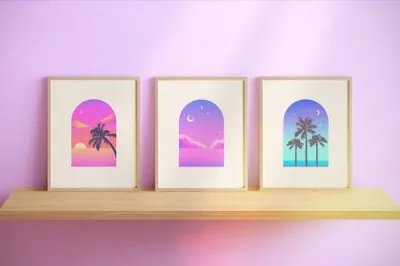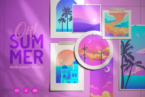 时尚潮流炫彩颗粒渐变虹彩Ins夏日度假风景插画素材合辑 Oh Summer! Neon sunset scene
