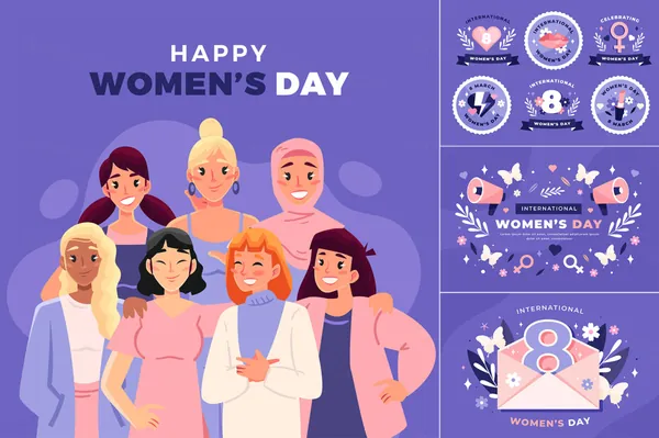 图穷联素材库 » 高质量三八妇女节38女神节贴纸徽章横幅宣传单海报EPS矢量创意人物插画素材合辑